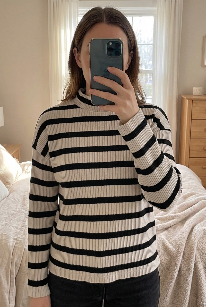 Pull femme stradivarius taille s debout, face à la caméra, dans une chambre à la lumière douce, avec une lumière naturelle filtrant par la fenêtre.
