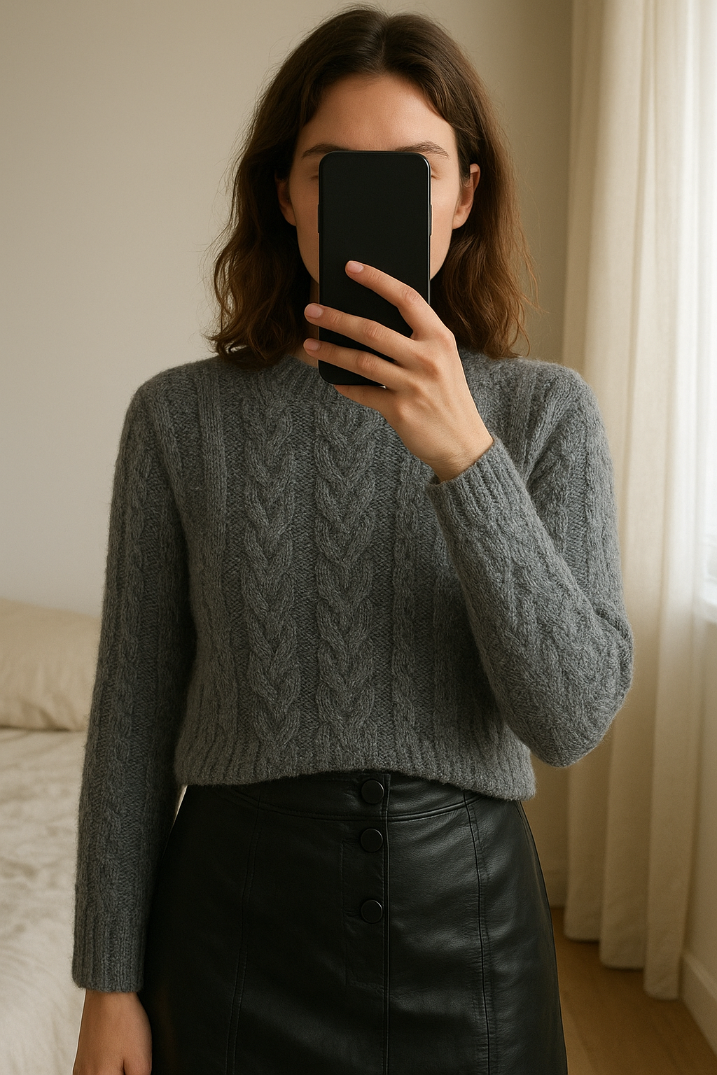 Pull femme torsadé gris anthracite - laine / boutique italiana debout, face à la caméra, dans une chambre à la lumière douce, avec une lumière naturelle filtrant par la fenêtre.
