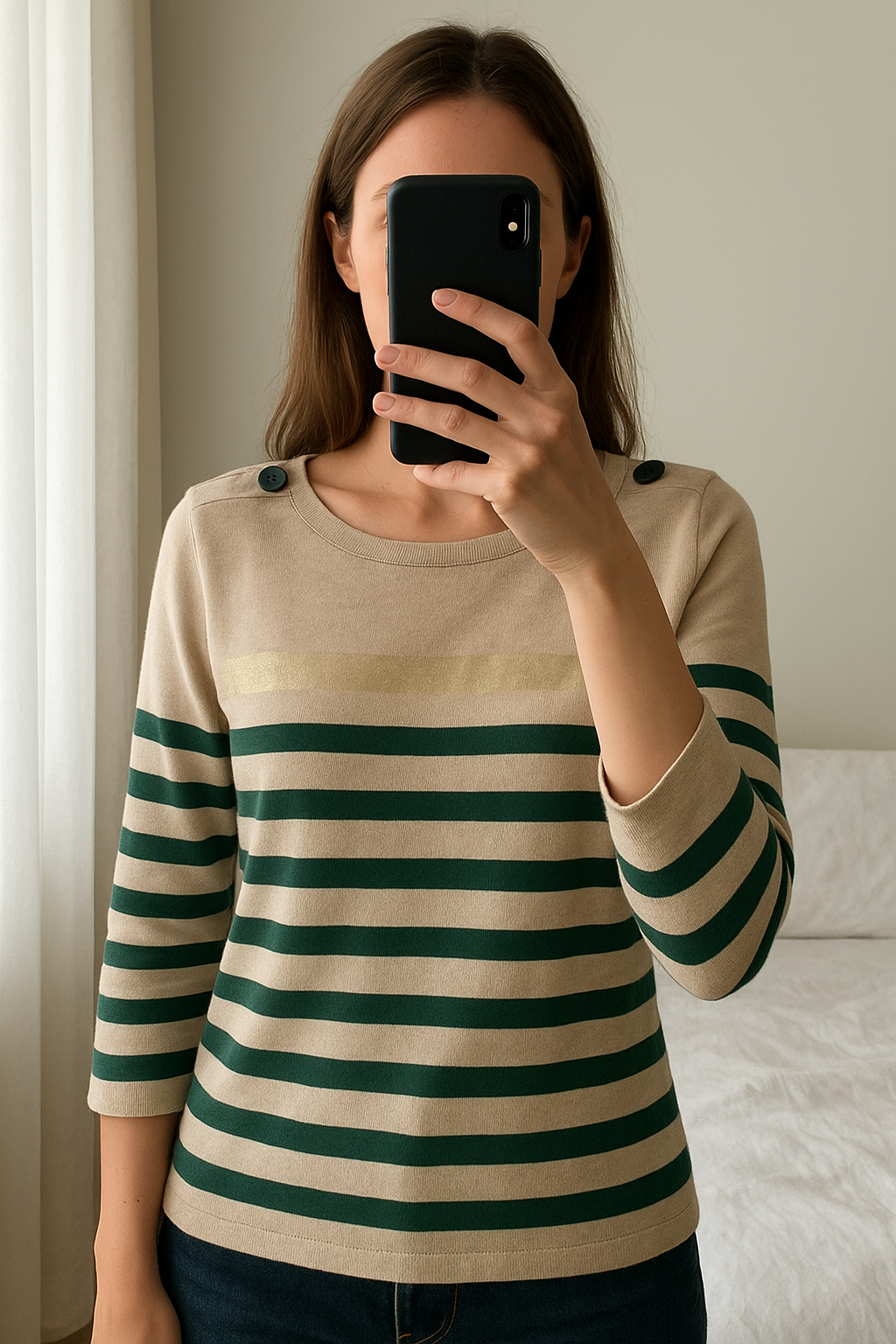 Pull grain de malice femme debout, face à la caméra, dans une chambre à la lumière douce, avec une lumière naturelle filtrant par la fenêtre.