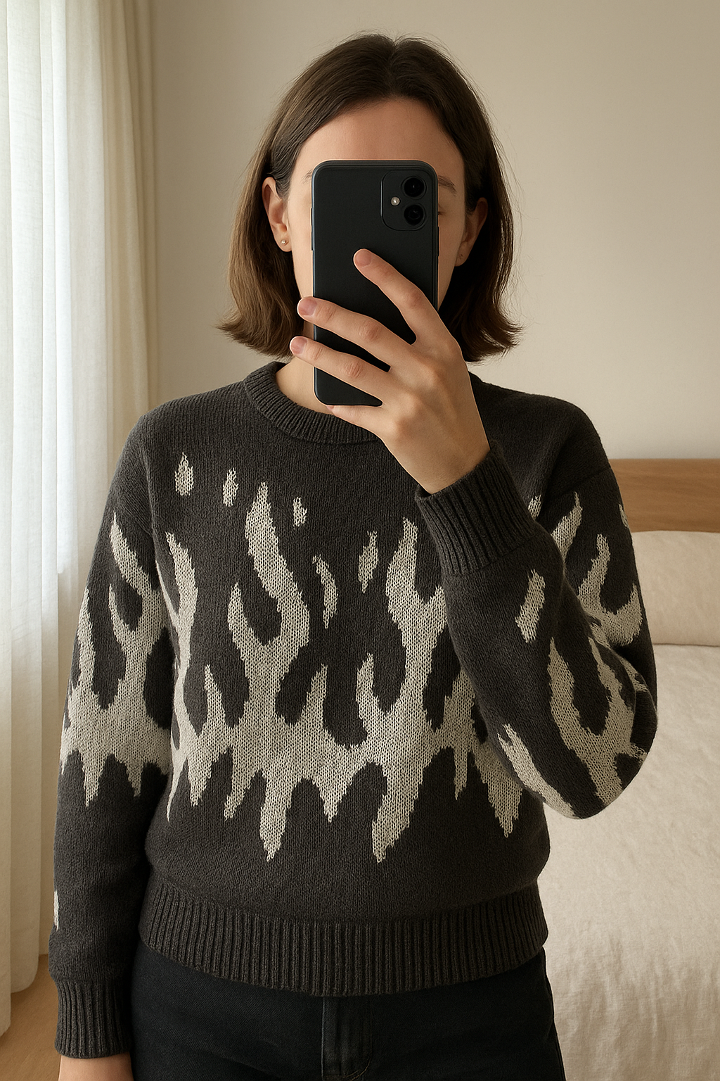 Pull Gris Vintage Taille M debout, face à la caméra, dans une chambre à la lumière douce, avec une lumière naturelle filtrant par la fenêtre.