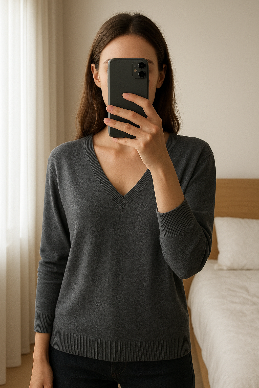 Pull H&M debout, face à la caméra, dans une chambre à la lumière douce, avec une lumière naturelle filtrant par la fenêtre.