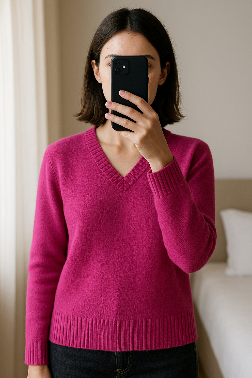 Pull Hermès en cachemire debout, face à la caméra, dans une chambre à la lumière douce, avec une lumière naturelle filtrant par la fenêtre.