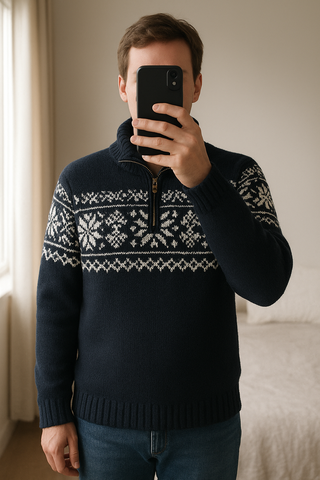 Pull hiver chaud debout, face à la caméra, dans une chambre à la lumière douce, avec une lumière naturelle filtrant par la fenêtre.