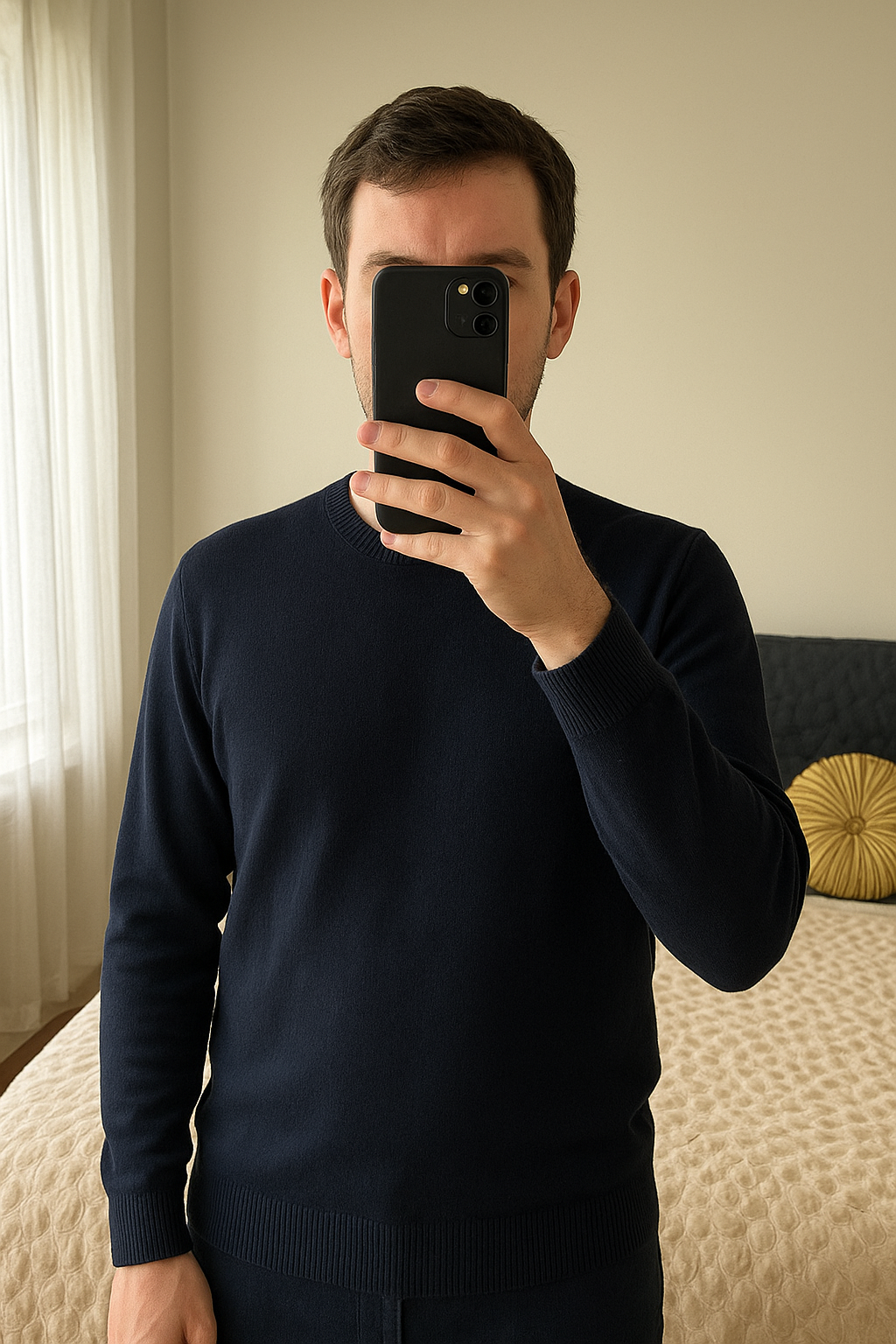 Pull léger homme – Bleu marine – Taille L debout, face à la caméra, dans une chambre à la lumière douce, avec une lumière naturelle filtrant par la fenêtre.