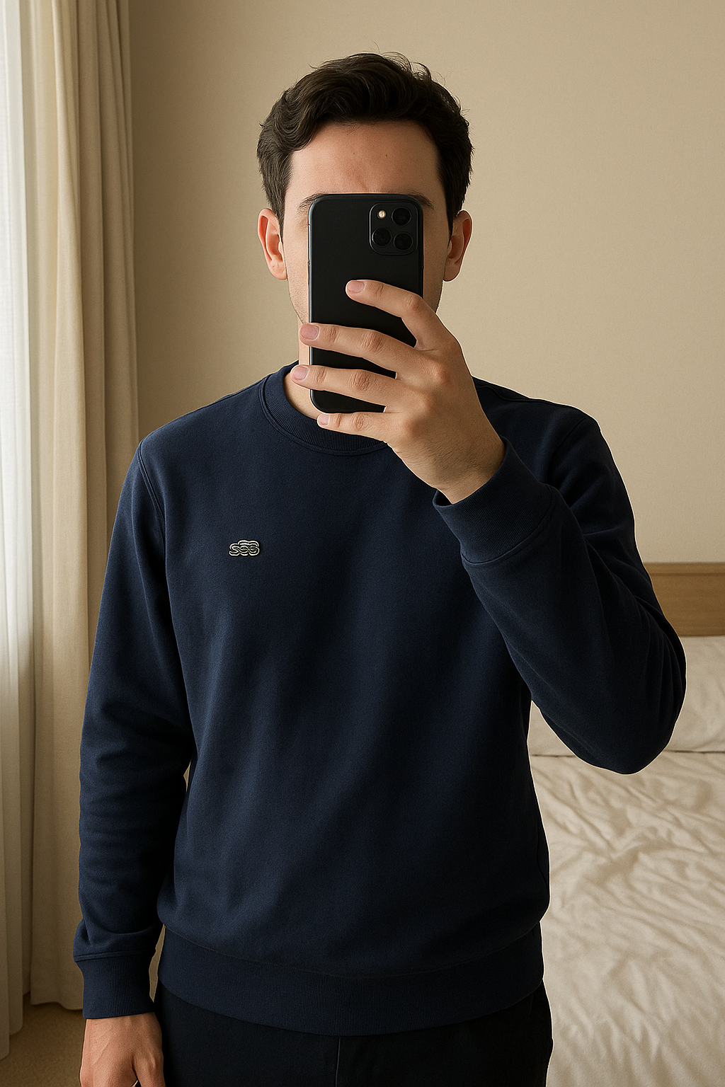 Pull Lacoste debout, face à la caméra, dans une chambre à la lumière douce, avec une lumière naturelle filtrant par la fenêtre.