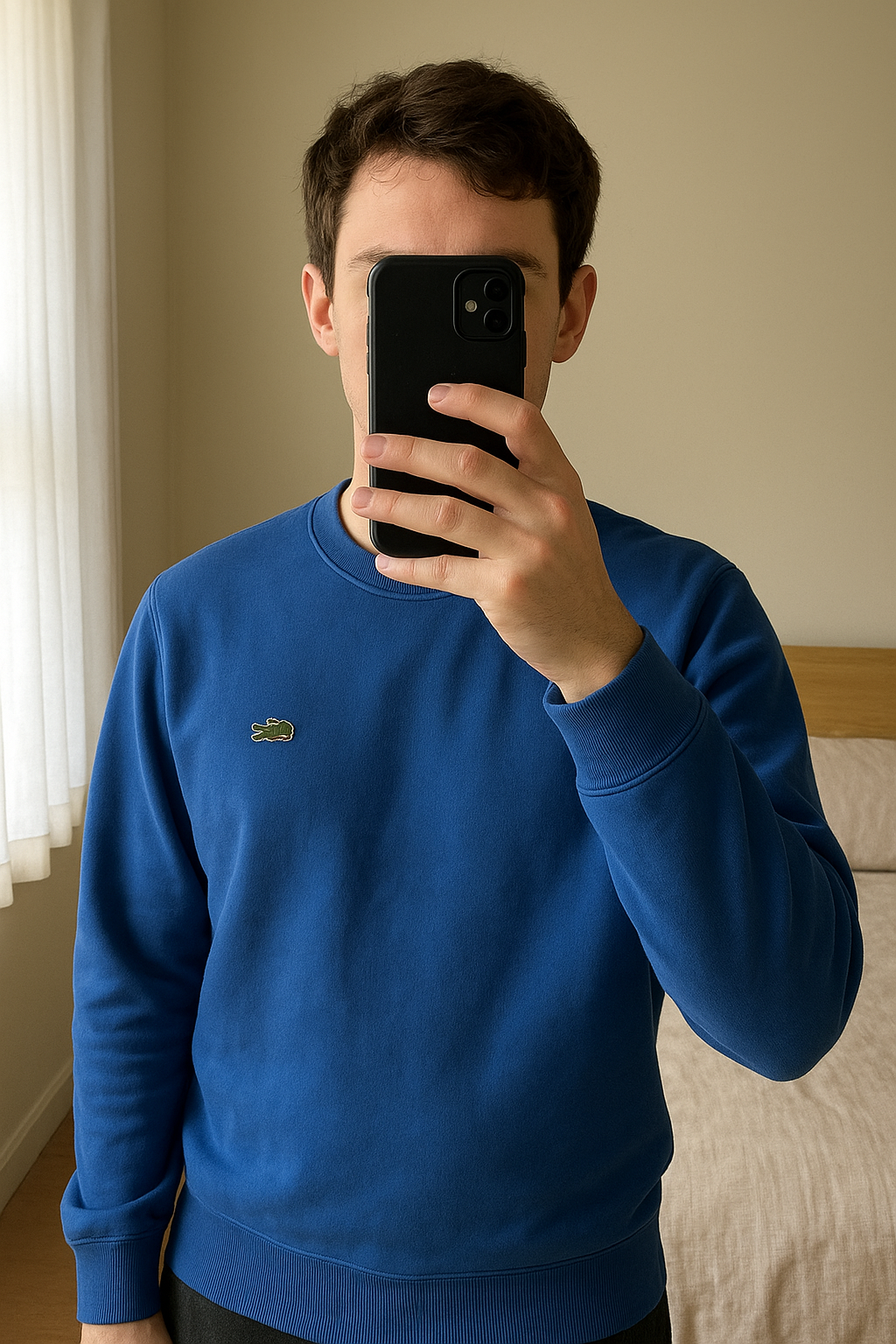 🟦 Pull Lacoste classique – Taille M – Très bon état 🟦 debout, face à la caméra, dans une chambre à la lumière douce, avec une lumière naturelle filtrant par la fenêtre.