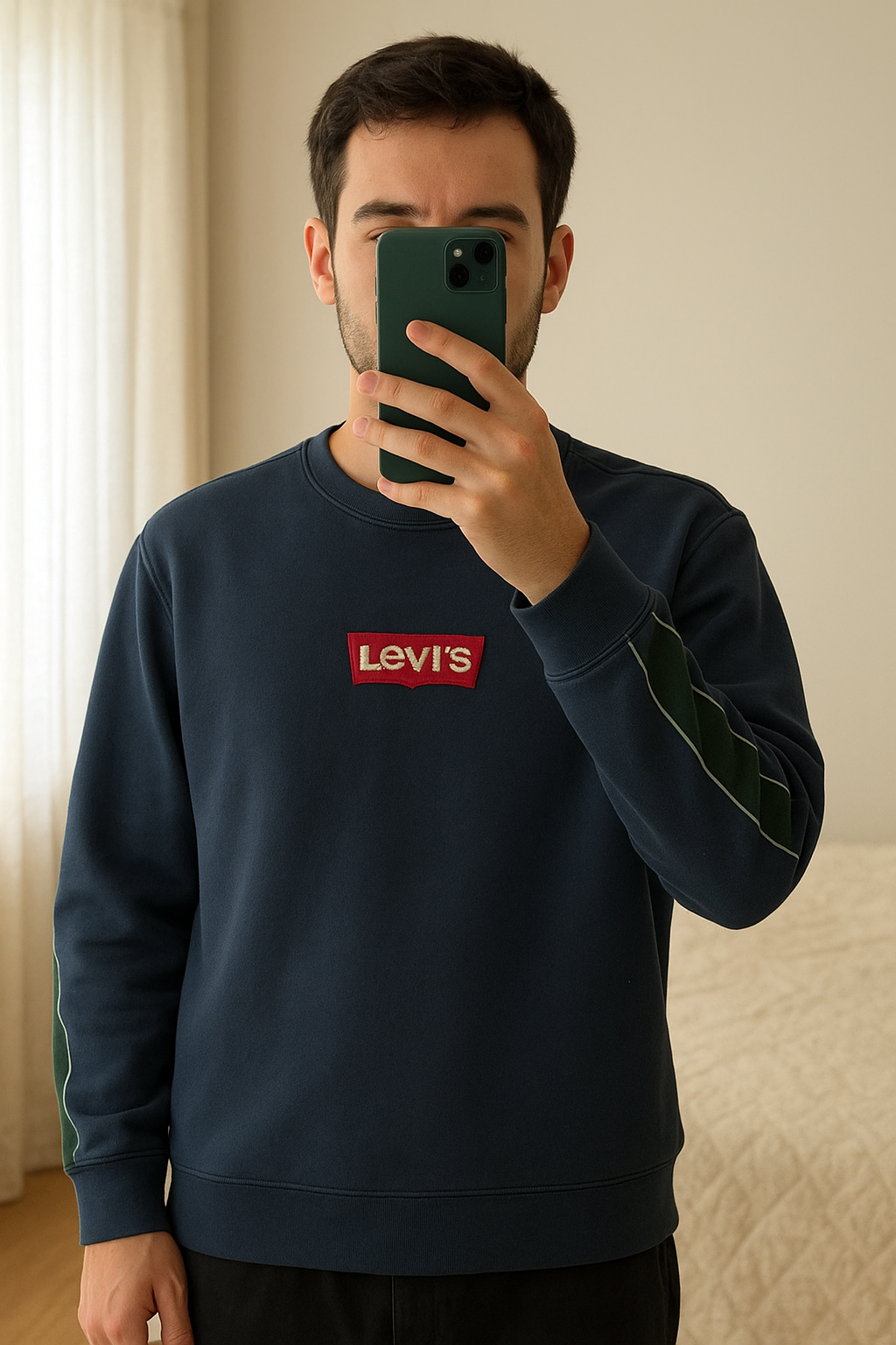 Pull Levi's Oversize Homme Taille XL. debout, face à la caméra, dans une chambre à la lumière douce, avec une lumière naturelle filtrant par la fenêtre.
