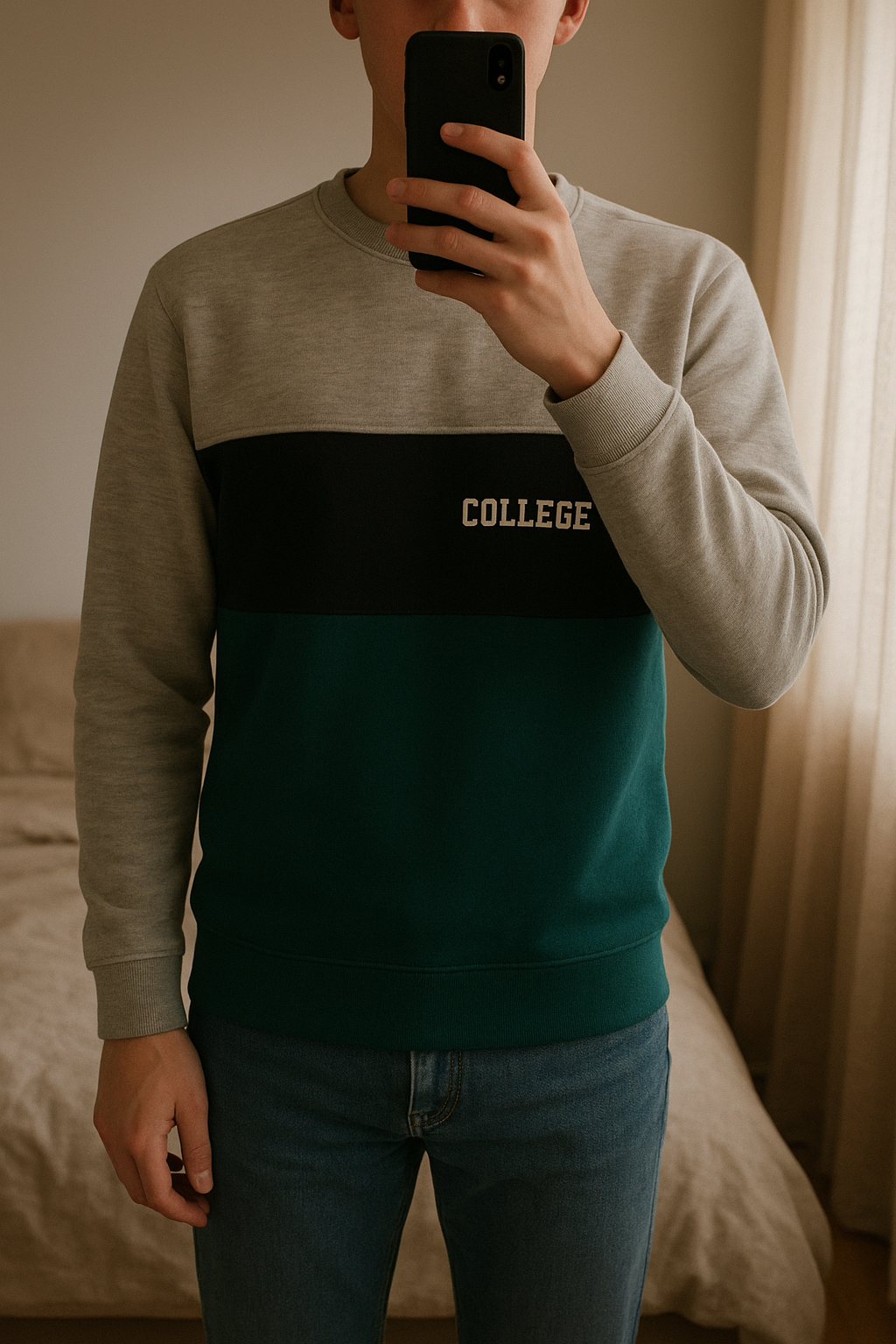 Pull marque collège 95 debout, face à la caméra, dans une chambre à la lumière douce, avec une lumière naturelle filtrant par la fenêtre.