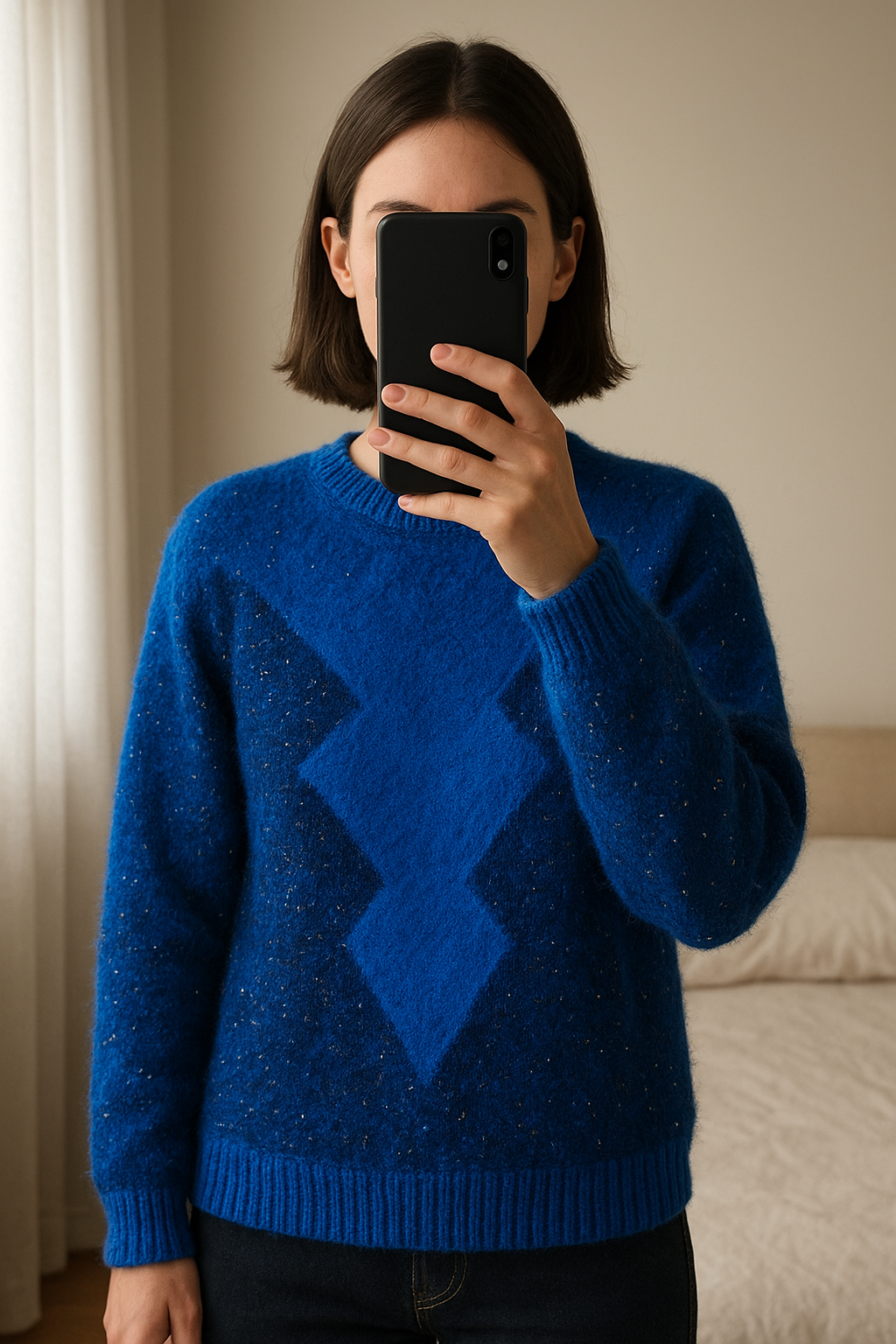 Pull Mohair debout, face à la caméra, dans une chambre à la lumière douce, avec une lumière naturelle filtrant par la fenêtre.