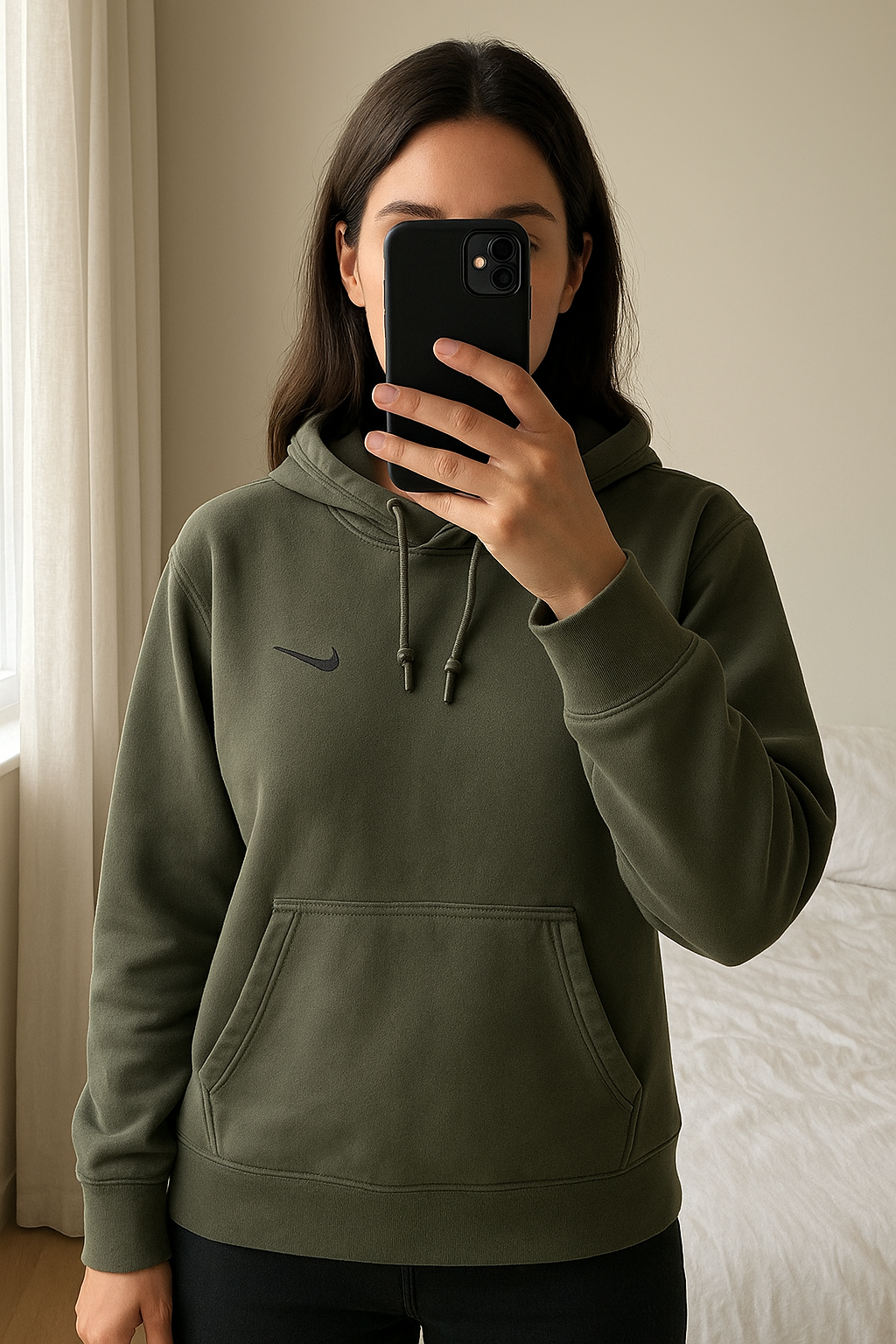 Pull nike debout, face à la caméra, dans une chambre à la lumière douce, avec une lumière naturelle filtrant par la fenêtre.