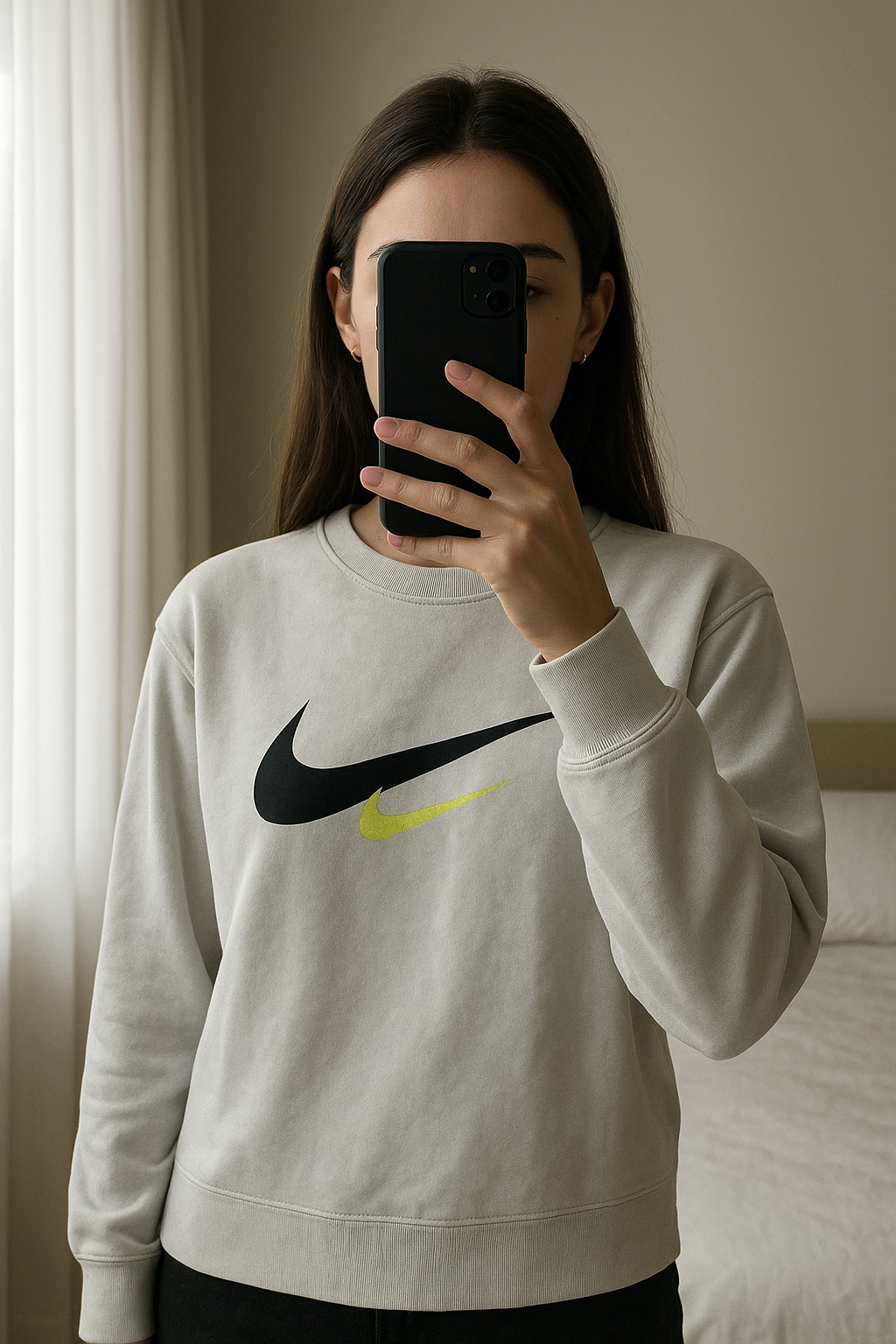 Pull Nike, S debout, face à la caméra, dans une chambre à la lumière douce, avec une lumière naturelle filtrant par la fenêtre.