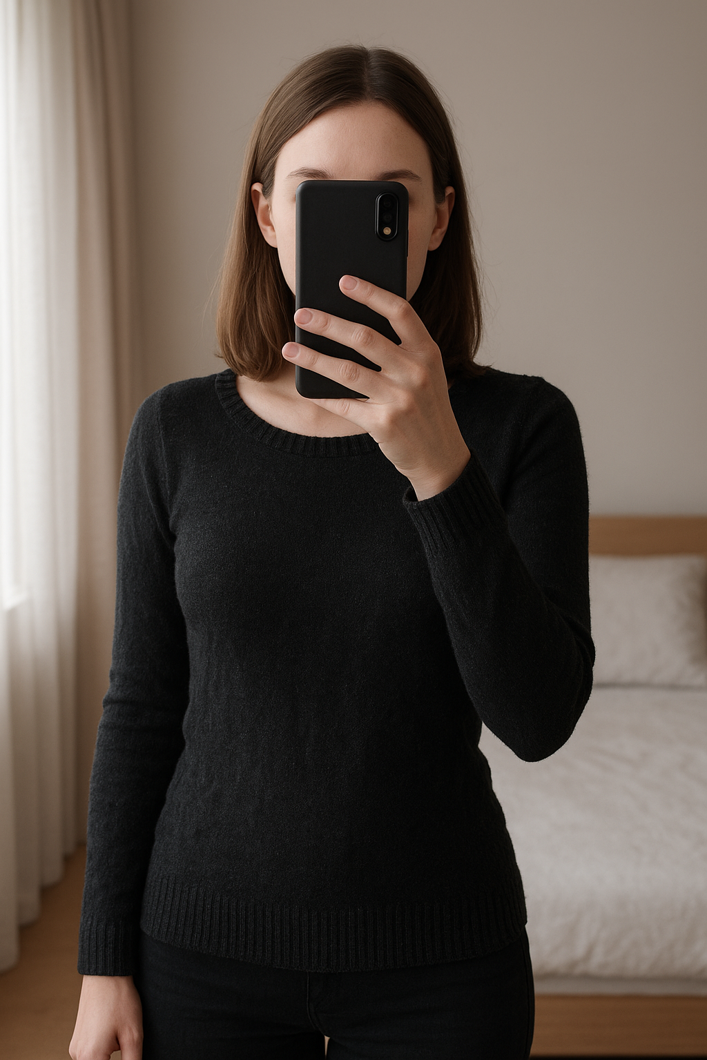 Pull noir pailleté debout, face à la caméra, dans une chambre à la lumière douce, avec une lumière naturelle filtrant par la fenêtre.