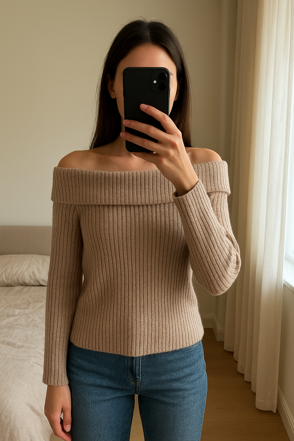 Pull only debout, face à la caméra, dans une chambre à la lumière douce, avec une lumière naturelle filtrant par la fenêtre.