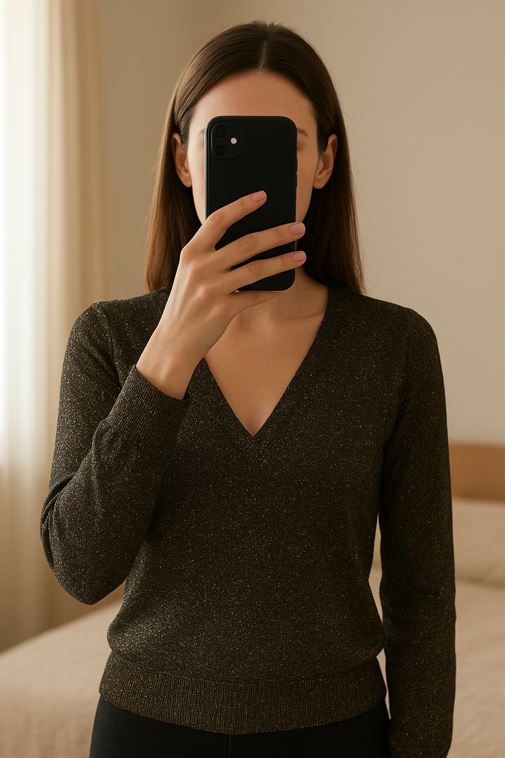 Pull pailleté debout, face à la caméra, dans une chambre à la lumière douce, avec une lumière naturelle filtrant par la fenêtre.