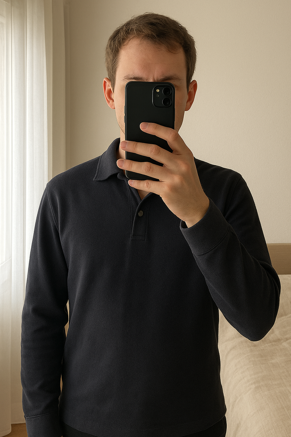 Pull polo debout, face à la caméra, dans une chambre à la lumière douce, avec une lumière naturelle filtrant par la fenêtre.