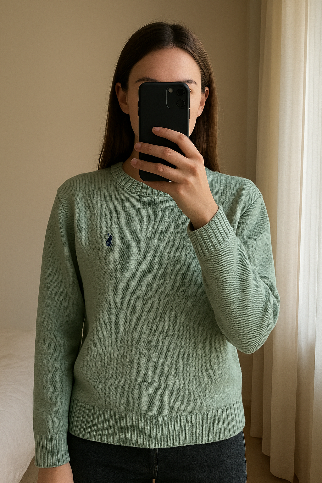Pull Polo Ralph Lauren vert menthe – coton – Taille M debout, face à la caméra, dans une chambre à la lumière douce, avec une lumière naturelle filtrant par la fenêtre.