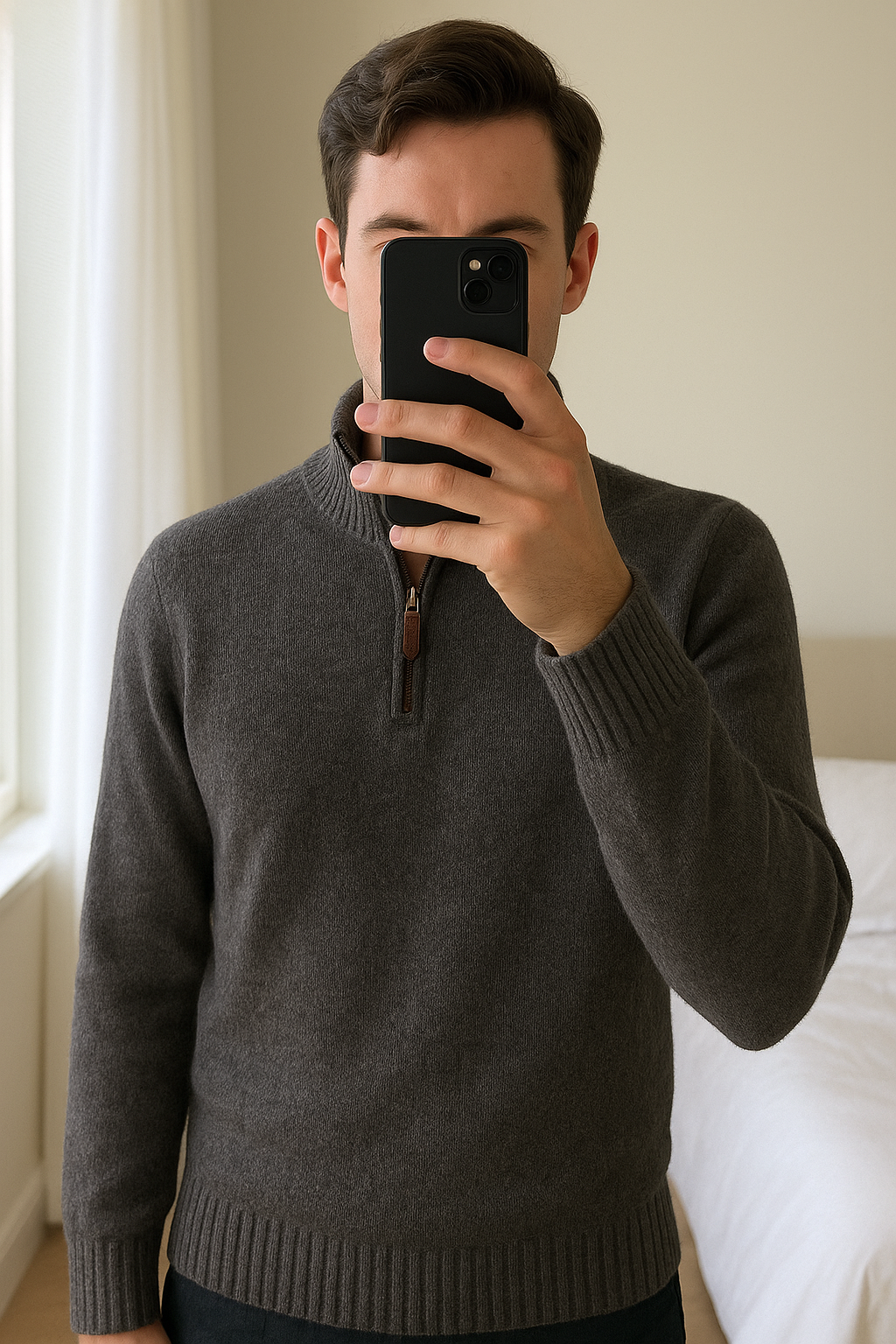 Pull Premium POLO Ralph Lauren – Demi-Zip Gris Anthracite debout, face à la caméra, dans une chambre à la lumière douce, avec une lumière naturelle filtrant par la fenêtre.