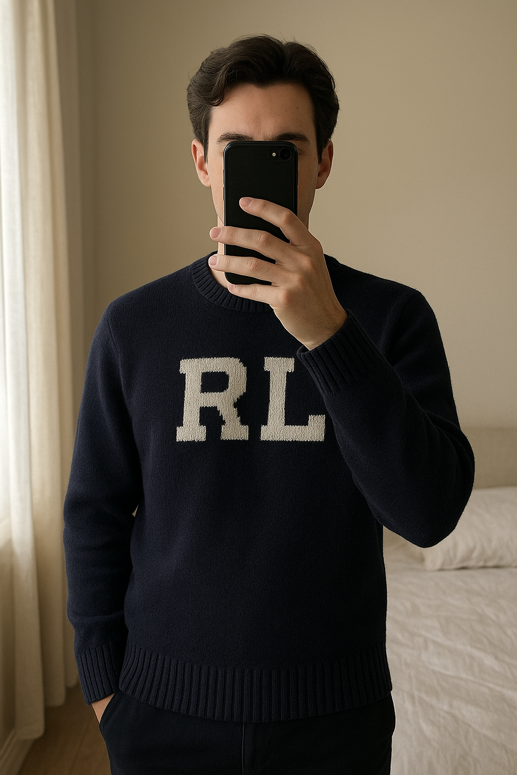 Pull Ralph Lauren debout, face à la caméra, dans une chambre à la lumière douce, avec une lumière naturelle filtrant par la fenêtre.