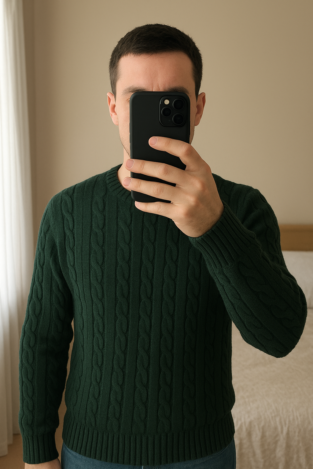 Pull Ralph Lauren debout, face à la caméra, dans une chambre à la lumière douce, avec une lumière naturelle filtrant par la fenêtre.