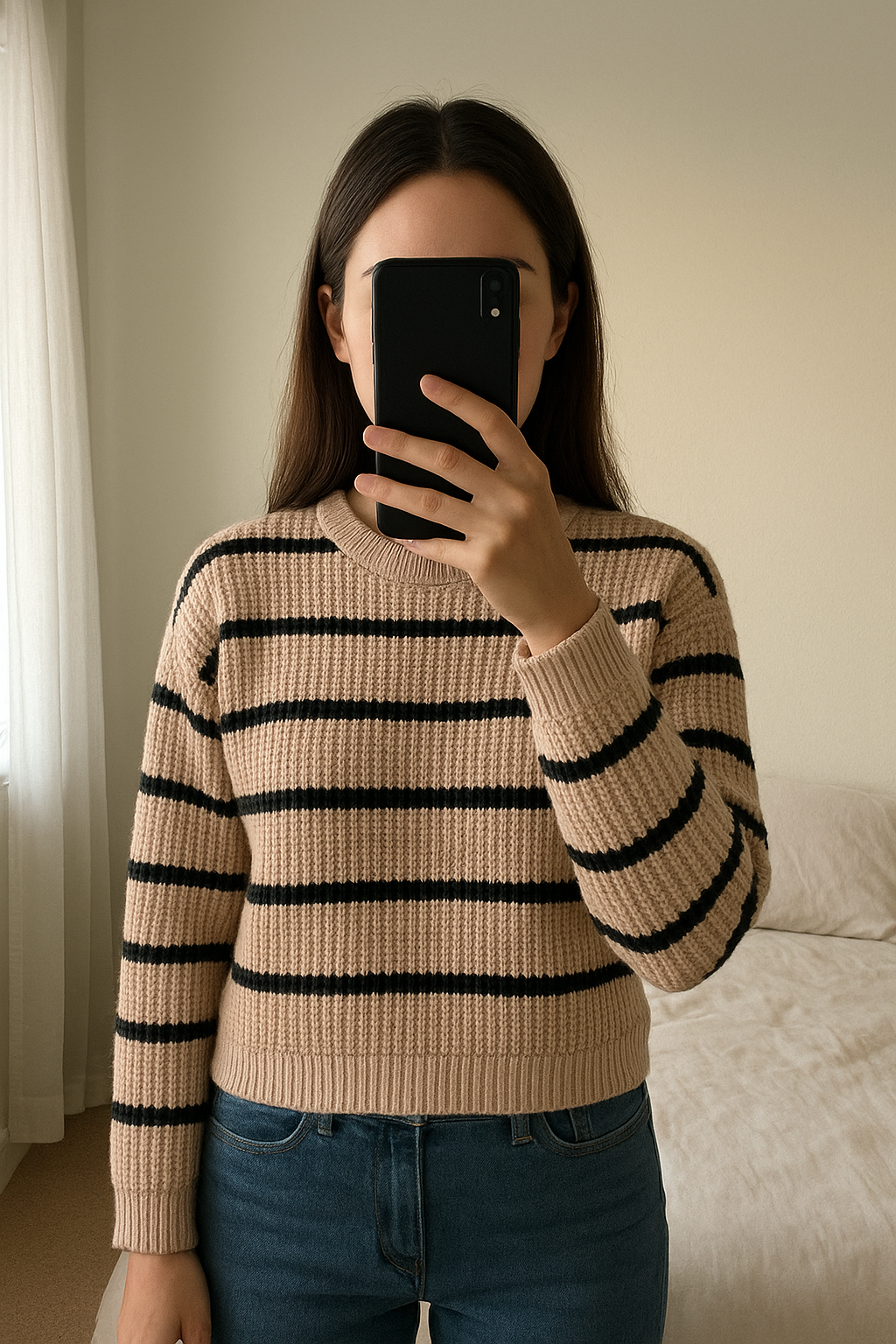 Pull à rayures M - Maglione a righe M donna inverno in piedi, rivolto verso la fotocamera, in una camera da letto con luce soffusa e luce naturale che filtra dalla finestra.