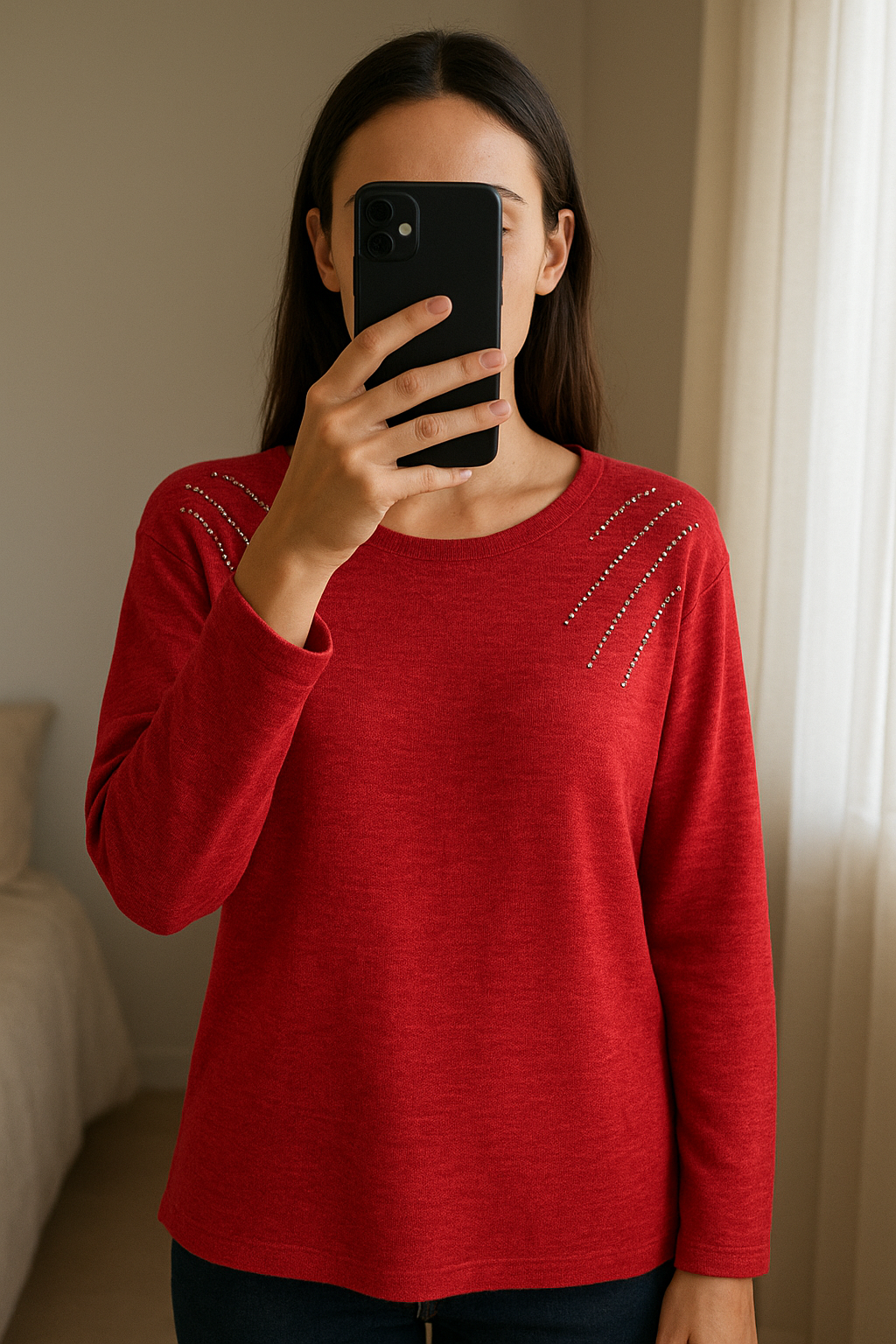 Pull rouge taille M debout, face à la caméra, dans une chambre à la lumière douce, avec une lumière naturelle filtrant par la fenêtre.