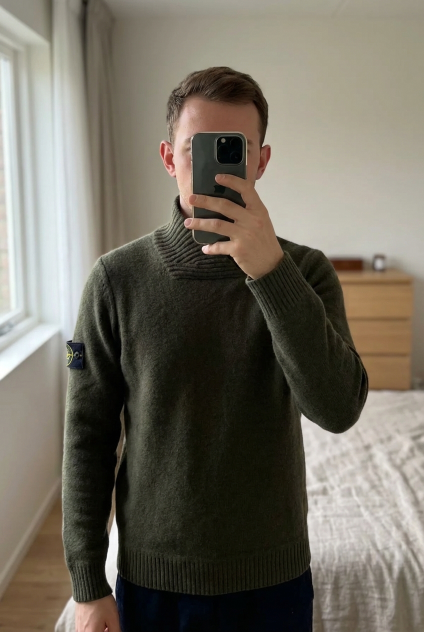Pull Stone Island vert kaki – col châle – 100% laine debout, face à la caméra, dans une chambre à la lumière douce, avec une lumière naturelle filtrant par la fenêtre.