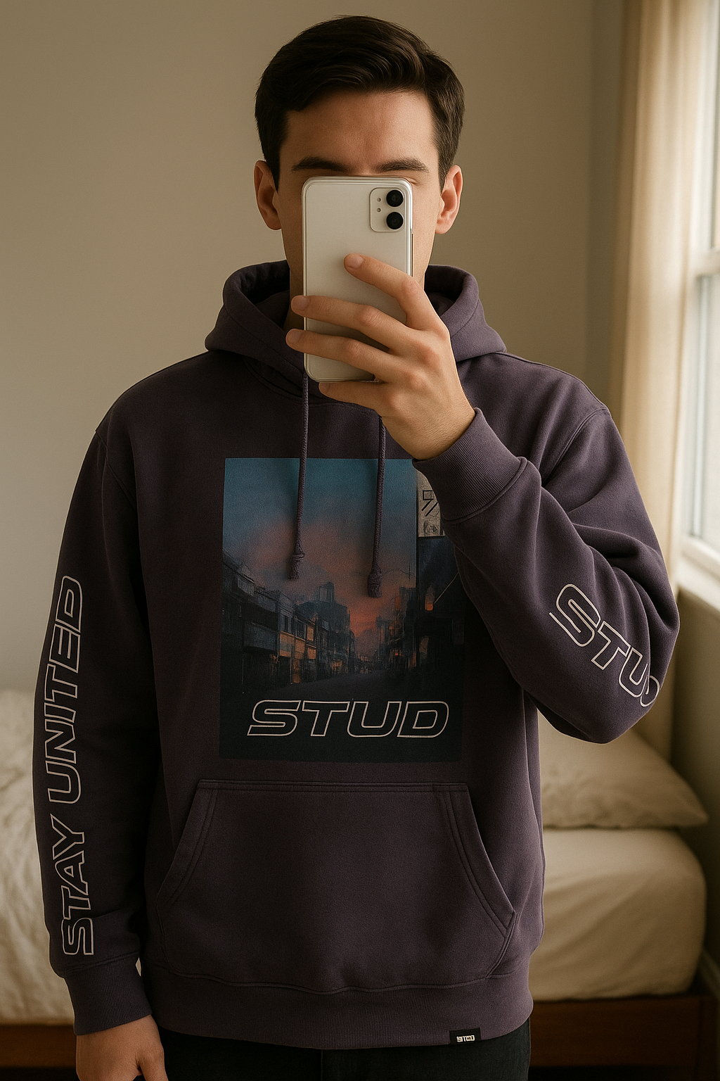 Pull STWD violet à motifs debout, face à la caméra, dans une chambre à la lumière douce, avec une lumière naturelle filtrant par la fenêtre.