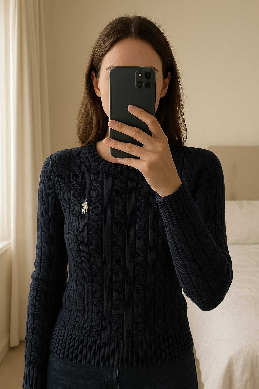Pull torsadé bleu marine Vintage- Ralph Lauren- Taille S/P debout, face à la caméra, dans une chambre à la lumière douce, avec une lumière naturelle filtrant par la fenêtre.
