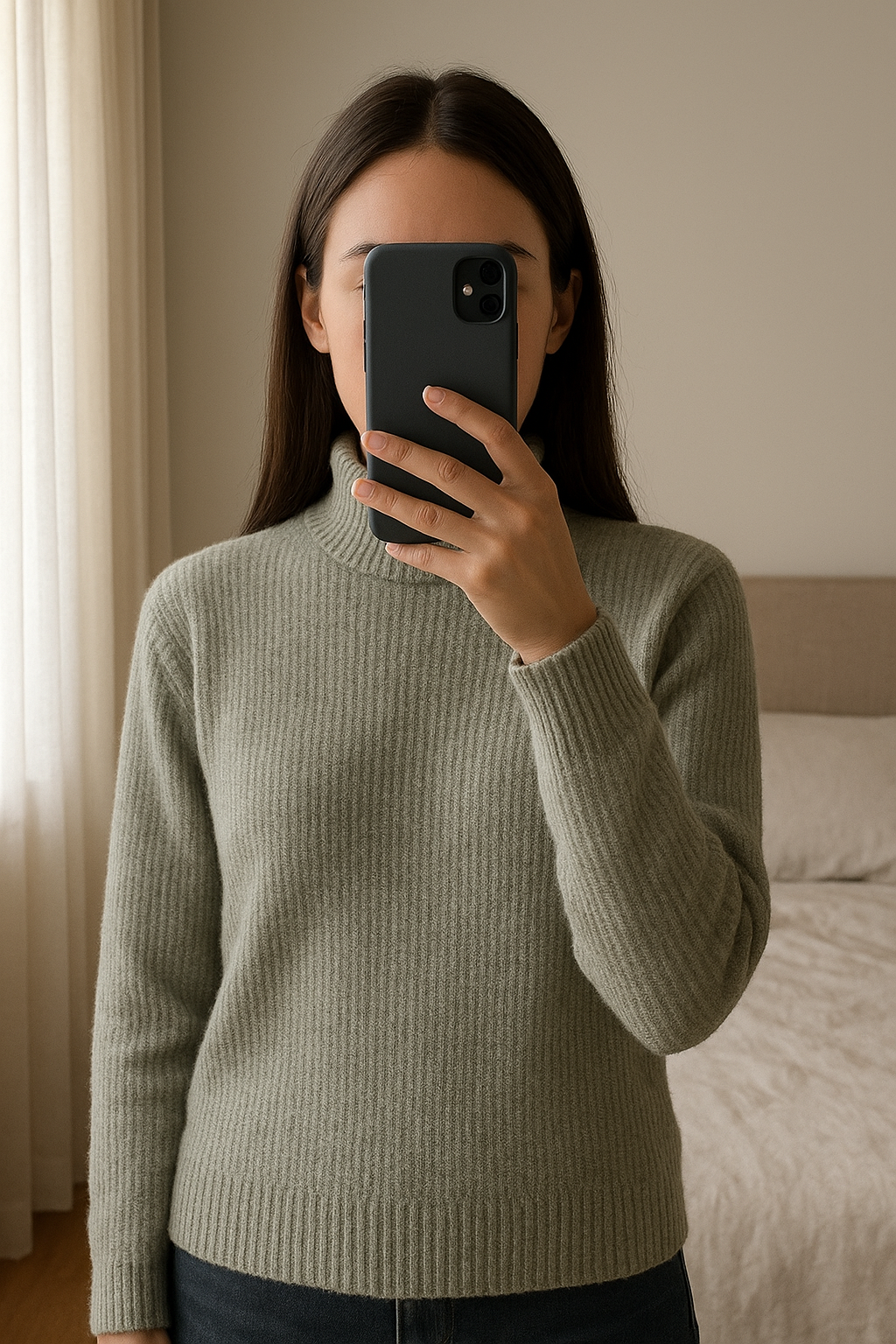🧶 Pull Uniqlo col montant – Taille XS – Vert clair debout, face à la caméra, dans une chambre à la lumière douce, avec une lumière naturelle filtrant par la fenêtre.