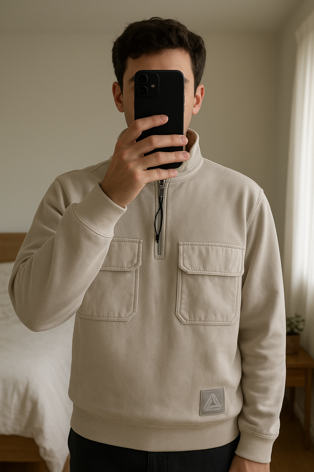 Pull zippé Palace debout, face à la caméra, dans une chambre à la lumière douce, avec une lumière naturelle filtrant par la fenêtre.