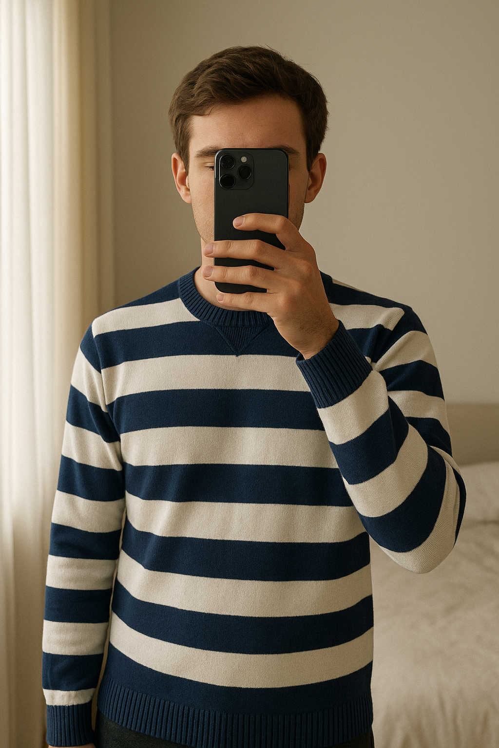 Pulls debout, face à la caméra, dans une chambre à la lumière douce, avec une lumière naturelle filtrant par la fenêtre.