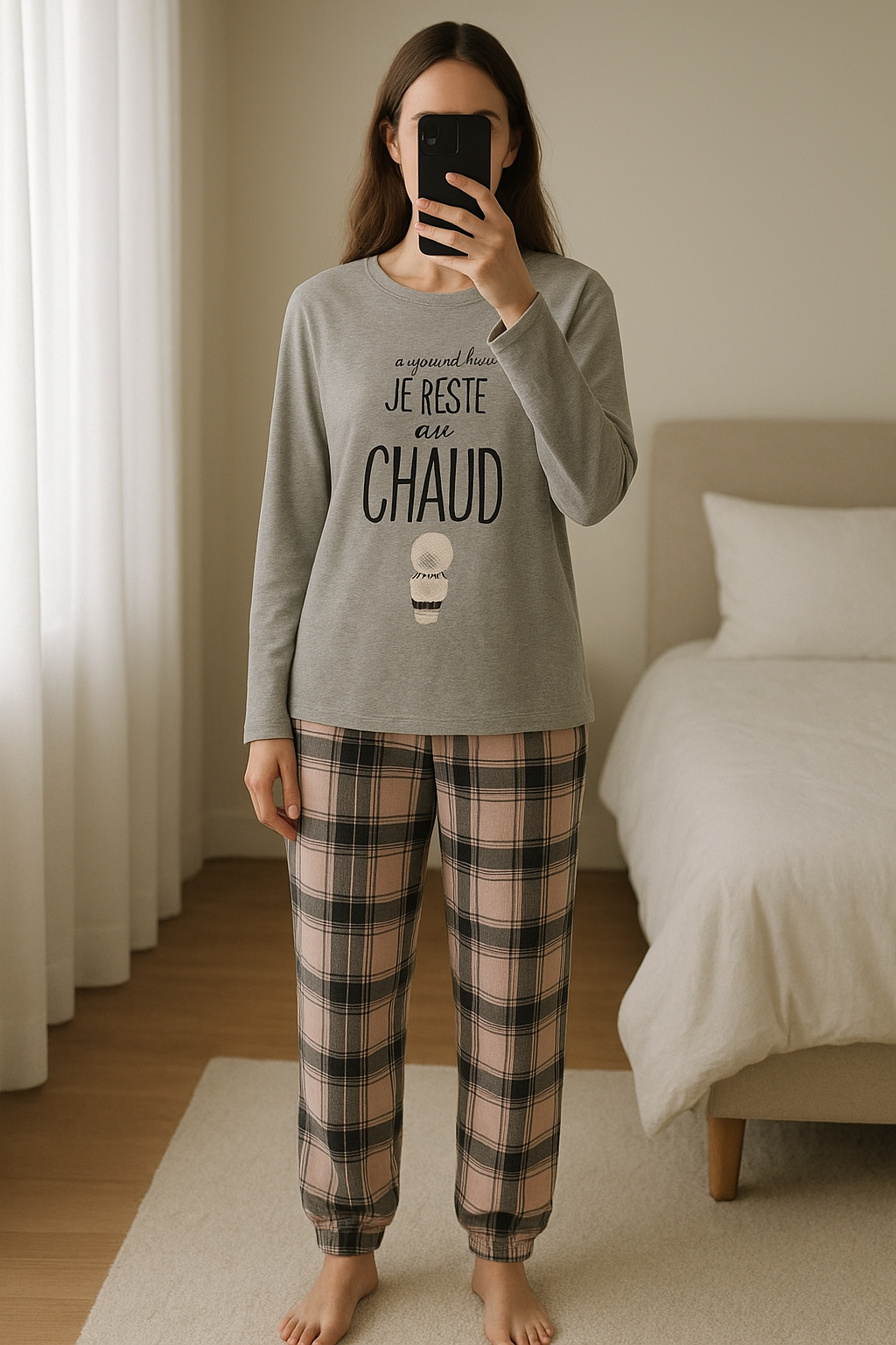 Pyjama Etam gris debout, face à la caméra, dans une chambre à la lumière douce, avec une lumière naturelle filtrant par la fenêtre.