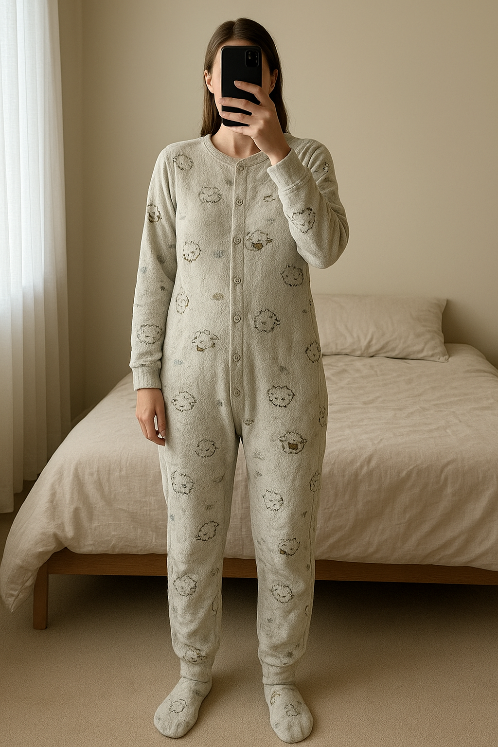 Pyjama kiabi debout, face à la caméra, dans une chambre à la lumière douce, avec une lumière naturelle filtrant par la fenêtre.