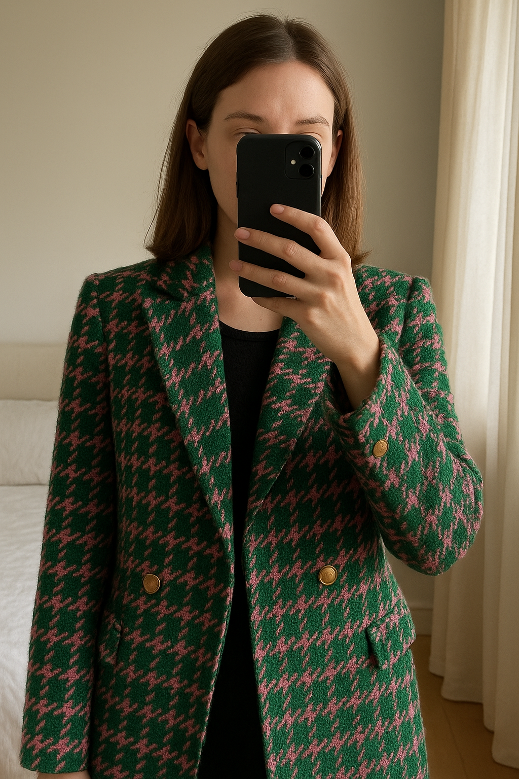 River Island Green & Pink Dogtooth Bouclé Check Blazer standing straight facing the camera, in a softly lit bedroom setting, with gentle natural light filtering through a window.