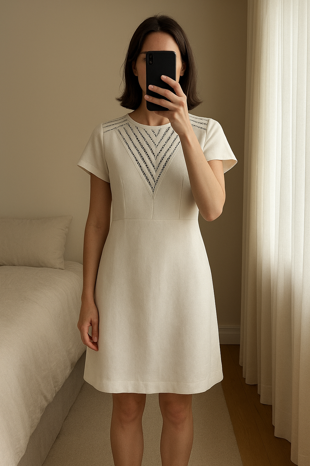 Robe blanc crème IKKS debout, face à la caméra, dans une chambre à la lumière douce, avec une lumière naturelle filtrant par la fenêtre.