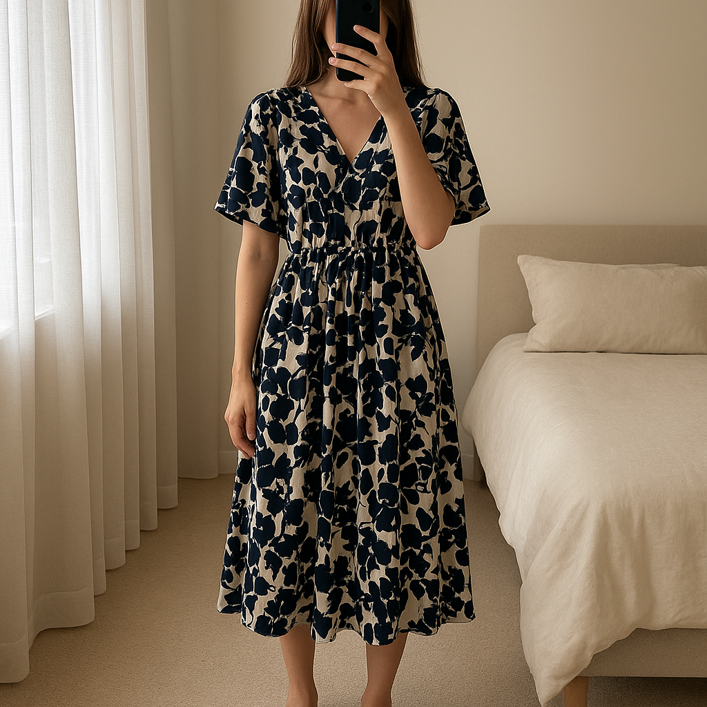 Robe blanche et marine debout, face à la caméra, dans une chambre à la lumière douce, avec une lumière naturelle filtrant par la fenêtre.