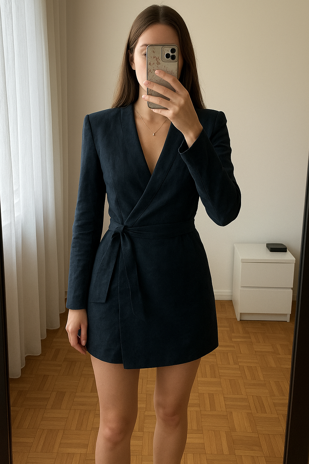 Robe blazer S debout, face à la caméra, dans une chambre à la lumière douce, avec une lumière naturelle filtrant par la fenêtre.