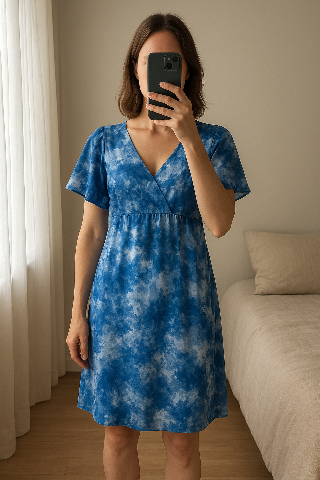 Robe bleu debout, face à la caméra, dans une chambre à la lumière douce, avec une lumière naturelle filtrant par la fenêtre.