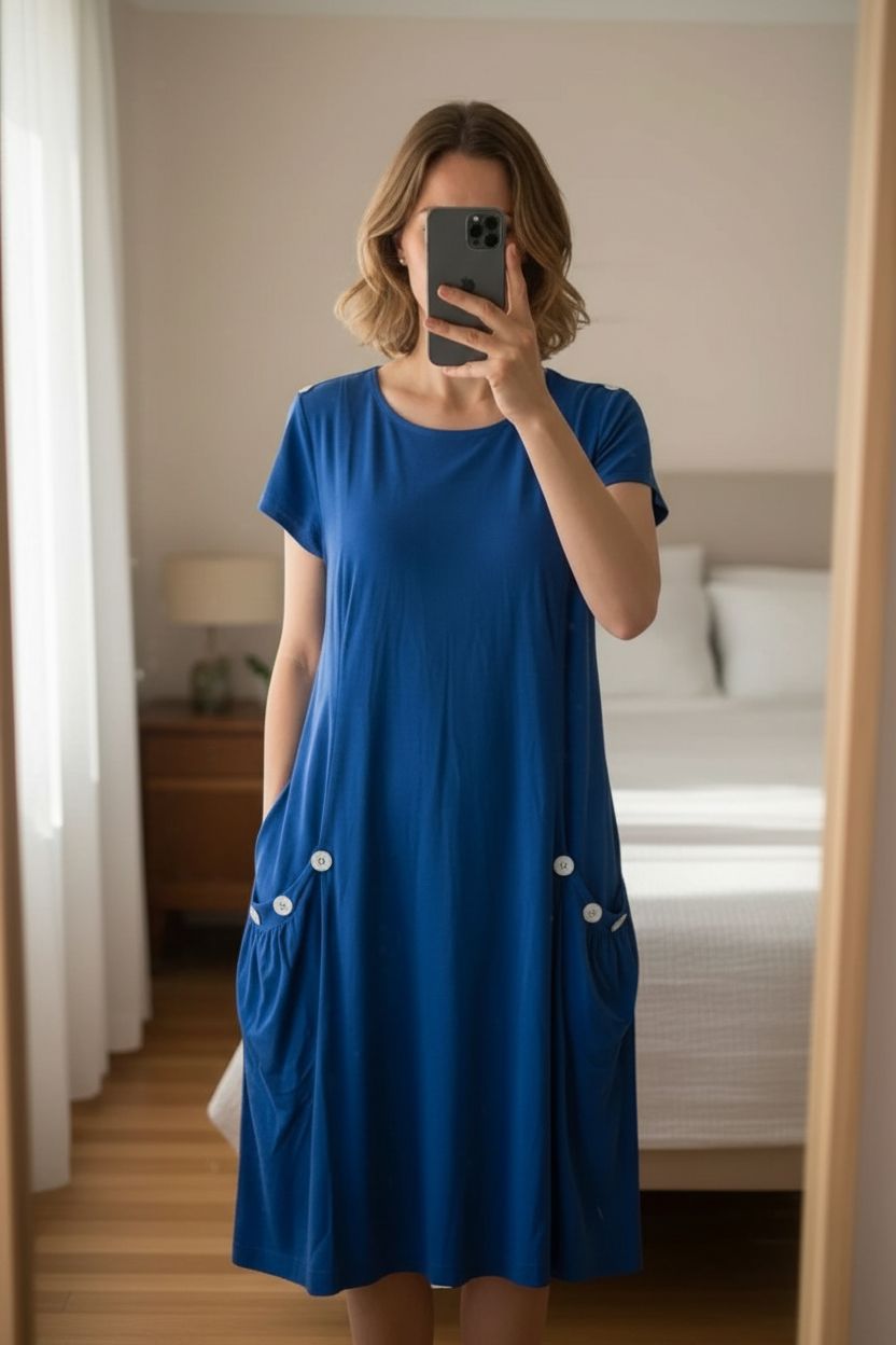 Robe bleu debout, face à la caméra, dans une chambre à la lumière douce, avec une lumière naturelle filtrant par la fenêtre.