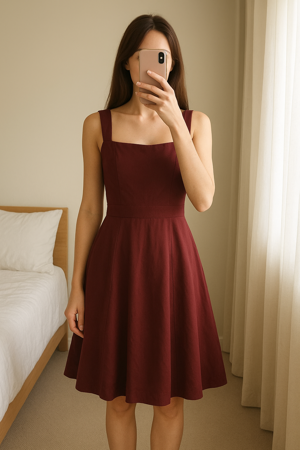 Robe bordeaux pour femme Shein, taille S debout, face à la caméra, dans une chambre à la lumière douce, avec une lumière naturelle filtrant par la fenêtre.