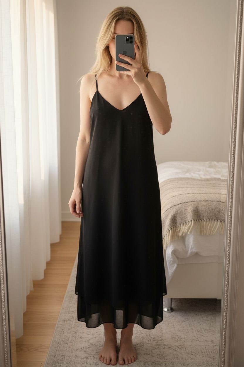 Robe à bretelles noire S - Abito estivo Nero in piedi, rivolto verso la fotocamera, in una camera da letto con luce soffusa e luce naturale che filtra dalla finestra.