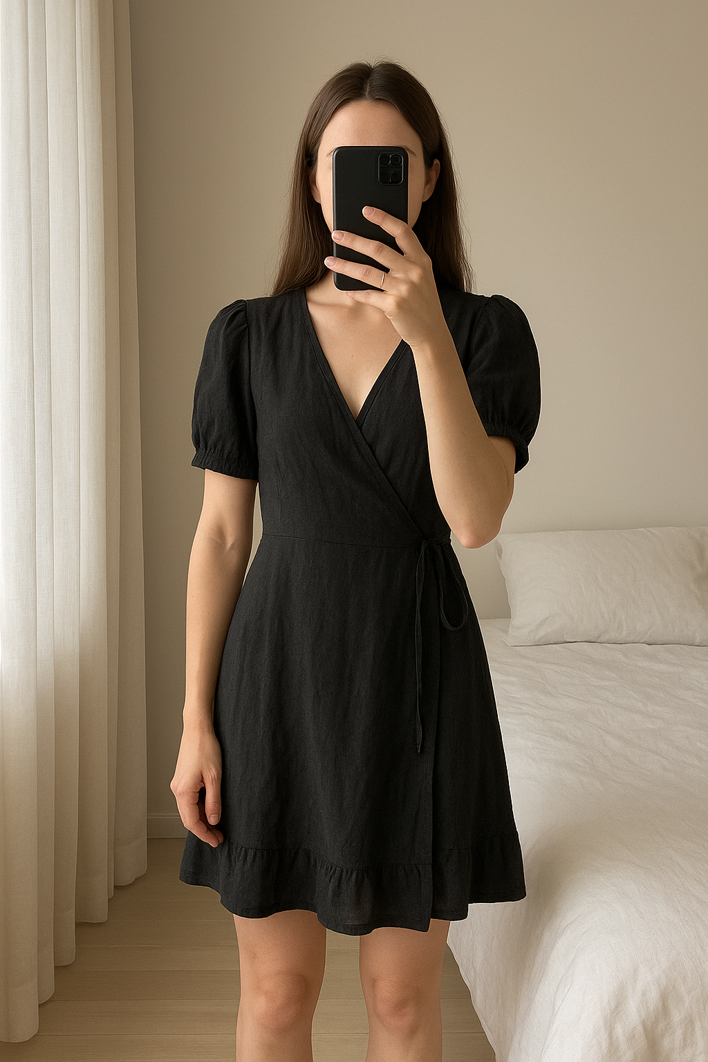 Robe cache cœur été debout, face à la caméra, dans une chambre à la lumière douce, avec une lumière naturelle filtrant par la fenêtre.