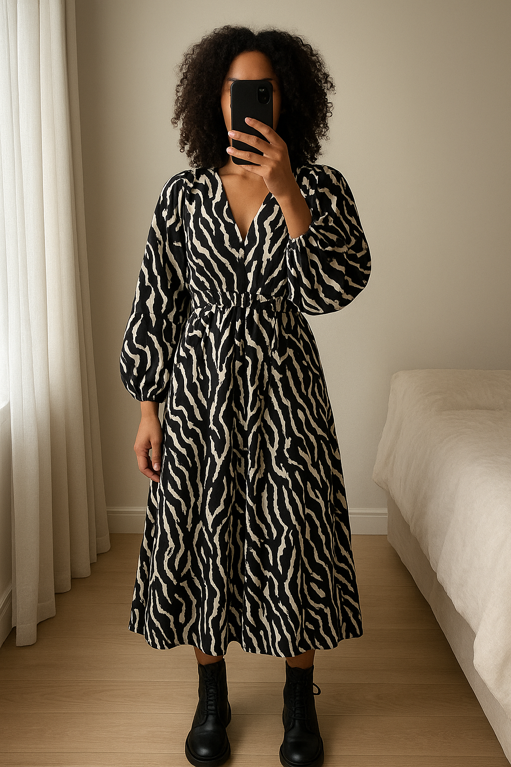 Robe cache-cœur zébrée ajustable debout, face à la caméra, dans une chambre à la lumière douce, avec une lumière naturelle filtrant par la fenêtre.