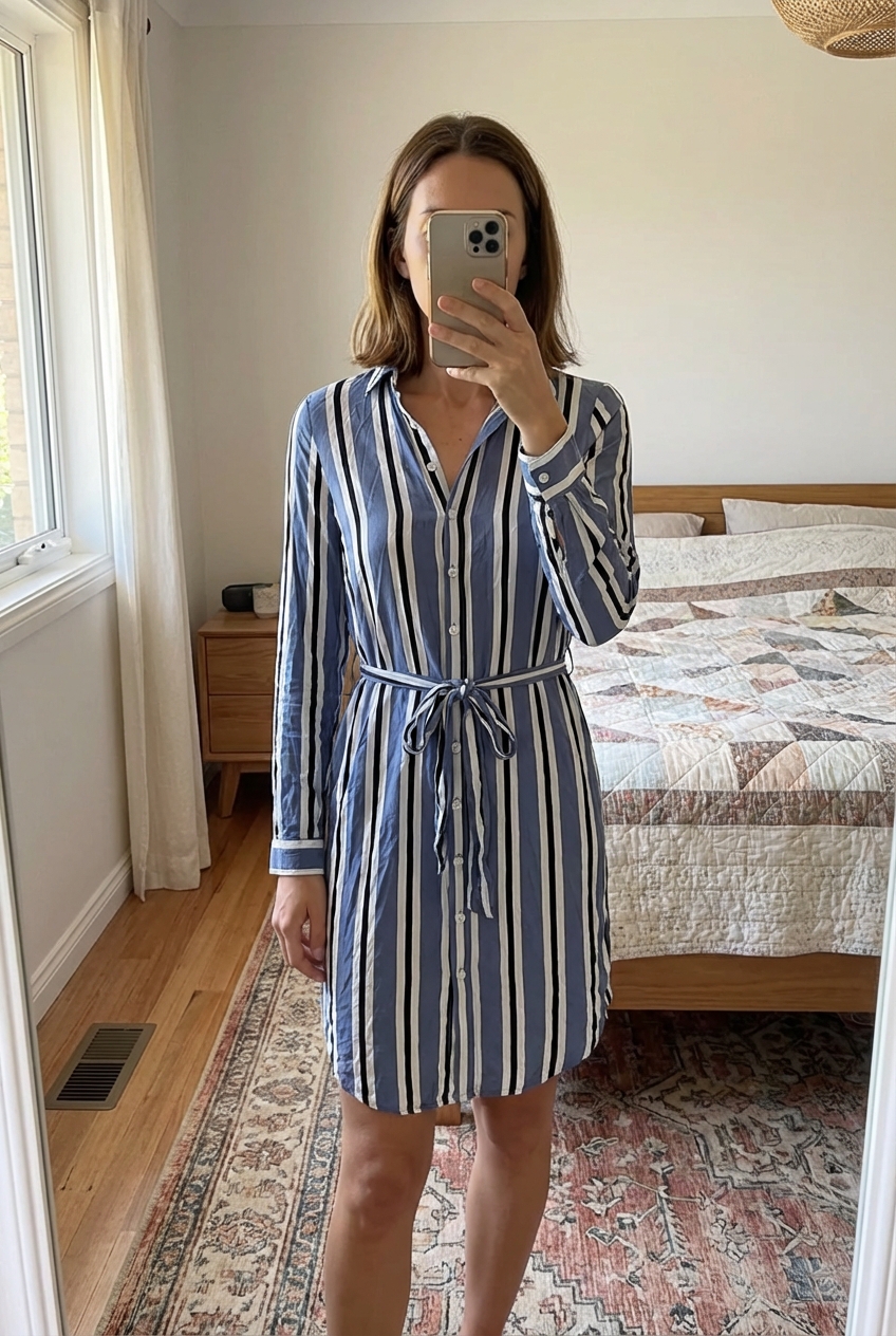 Une personne en Robe chemise rayée bleu/blanc/noir – Atmosphere – Taille 34 (XS) debout, face à la caméra, avec une silhouette fine, dans une chambre à la lumière douce, avec une lumière naturelle filtrant par la fenêtre.