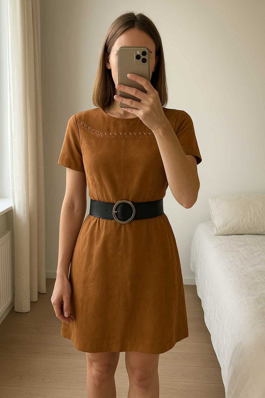 Robe courte debout, face à la caméra, dans une chambre à la lumière douce, avec une lumière naturelle filtrant par la fenêtre.