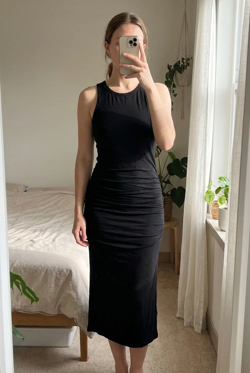 Robe d’été moulante, longue debout, face à la caméra, dans une chambre à la lumière douce, avec une lumière naturelle filtrant par la fenêtre.