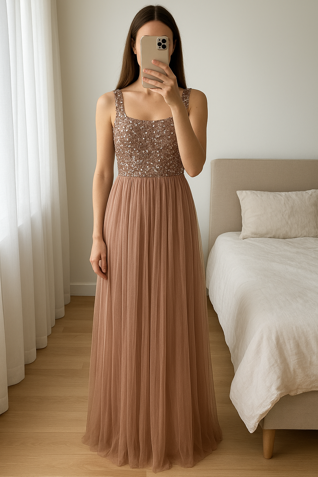 Robe de demoiselle d'honneur neuve Maya Deluxe em pé, de frente para a câmera, em um quarto com iluminação suave e luz natural filtrando pela janela.