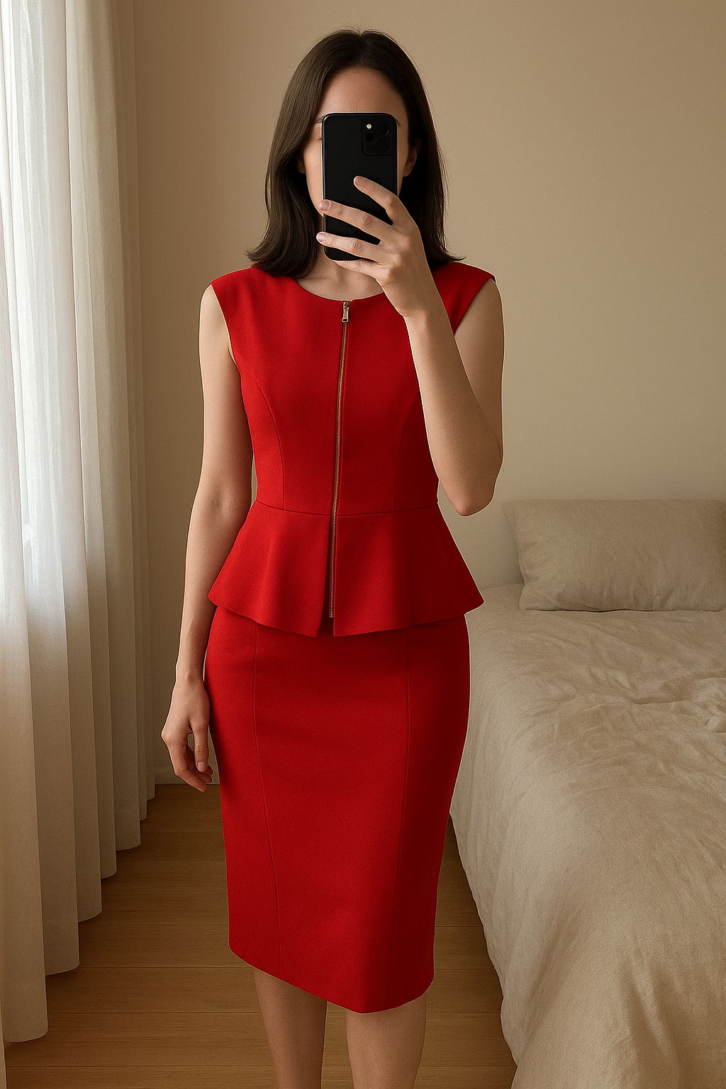 Robe de fête chic rouge Ted Baker M/L debout, face à la caméra, dans une chambre à la lumière douce, avec une lumière naturelle filtrant par la fenêtre.