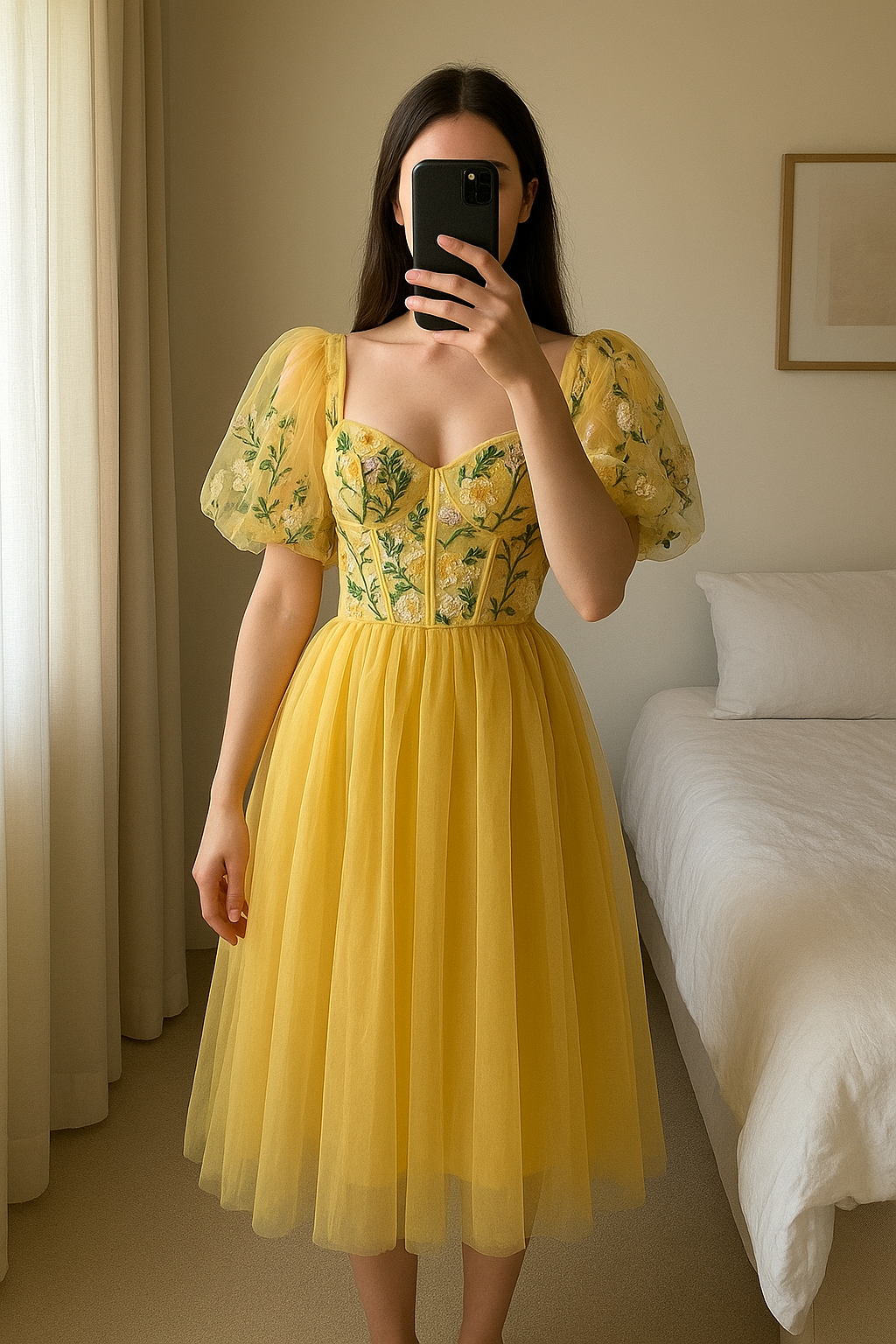 Robe de fêtes debout, face à la caméra, dans une chambre à la lumière douce, avec une lumière naturelle filtrant par la fenêtre.