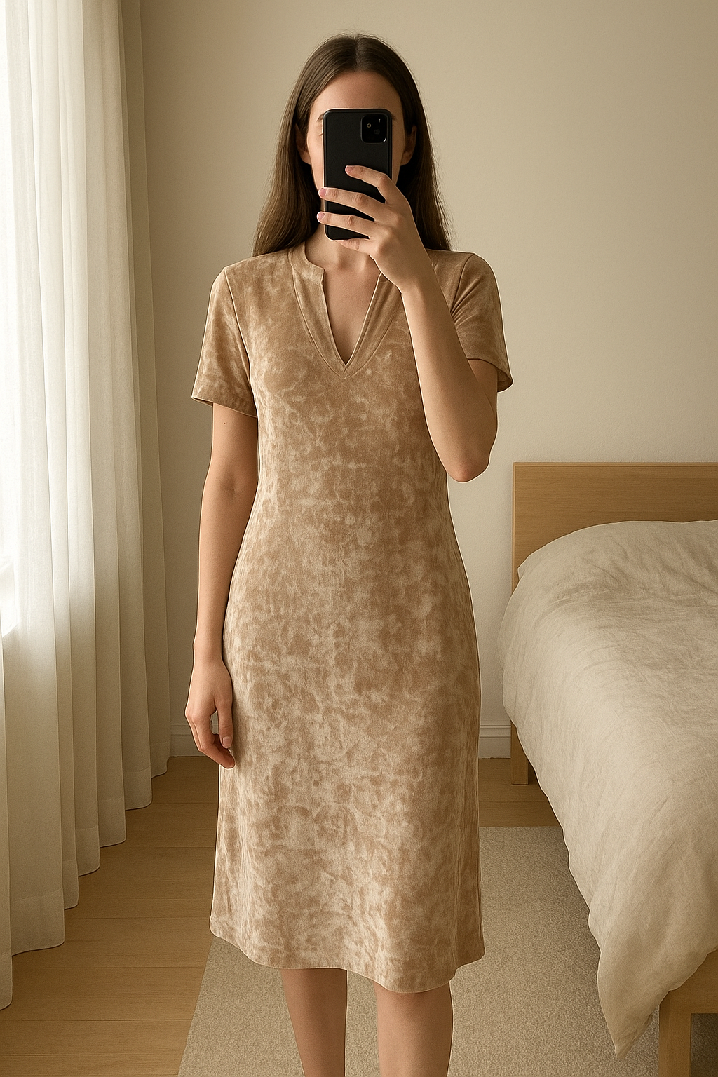 Robe de soirée debout, face à la caméra, dans une chambre à la lumière douce, avec une lumière naturelle filtrant par la fenêtre.